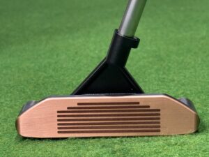KESHIN PUTTER ネック紹介 ワイドブリッジオフセットネック ヒールからトゥ方向へ橋のように架かるワイドブリッジ構造により、 ヘッド全体の剛性が大幅に高まり、インパクト時のねじれを抑制。ミスヒット時でもフェースの向きが乱れにくく、ラインに乗った安定した転がりを生み出します。ヒール装着でありながら重心バランスはフェースバランス寄りとなり、 トゥフローを抑えたいプレイヤーに理想的な挙動を提供します。 ワイドブリッジオンフェースネック フェース中央にすっと構えられる素直な見え方と、 ヘッド全体を包み込むように支えるワイドブリッジの安定感。芯を少し外しても方向性が乱れにくく、 狙ったラインへそのまま押し出すような真っすぐの転がりが得られます。センターに構えたい、でも安定性も欲しい── そんなプレイヤーに最適な、安心感のあるオンフェースネックです。 ←前のネック(ブリッジオフセットネック、ブリッジオンフェースネック) ネック一覧に戻る